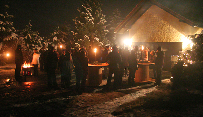 Nach dieser gelungenen Einstimmung machte sich die Gruppe mit Fackeln auf den Weg durch die dunkle Nacht. Nach der ca. 1km langen Wanderung konnten sich alle bei heißem Punsch stärken, sich gemütlich am Feuer wärmen und den weihnachtlichen Klängen der Bläsergruppe lauschen.